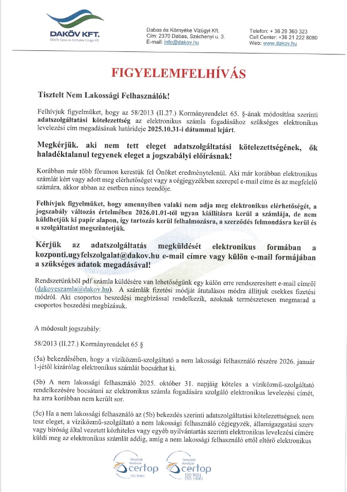 Daköv Tájékoztató NEM lakossági fogyasztók részére!