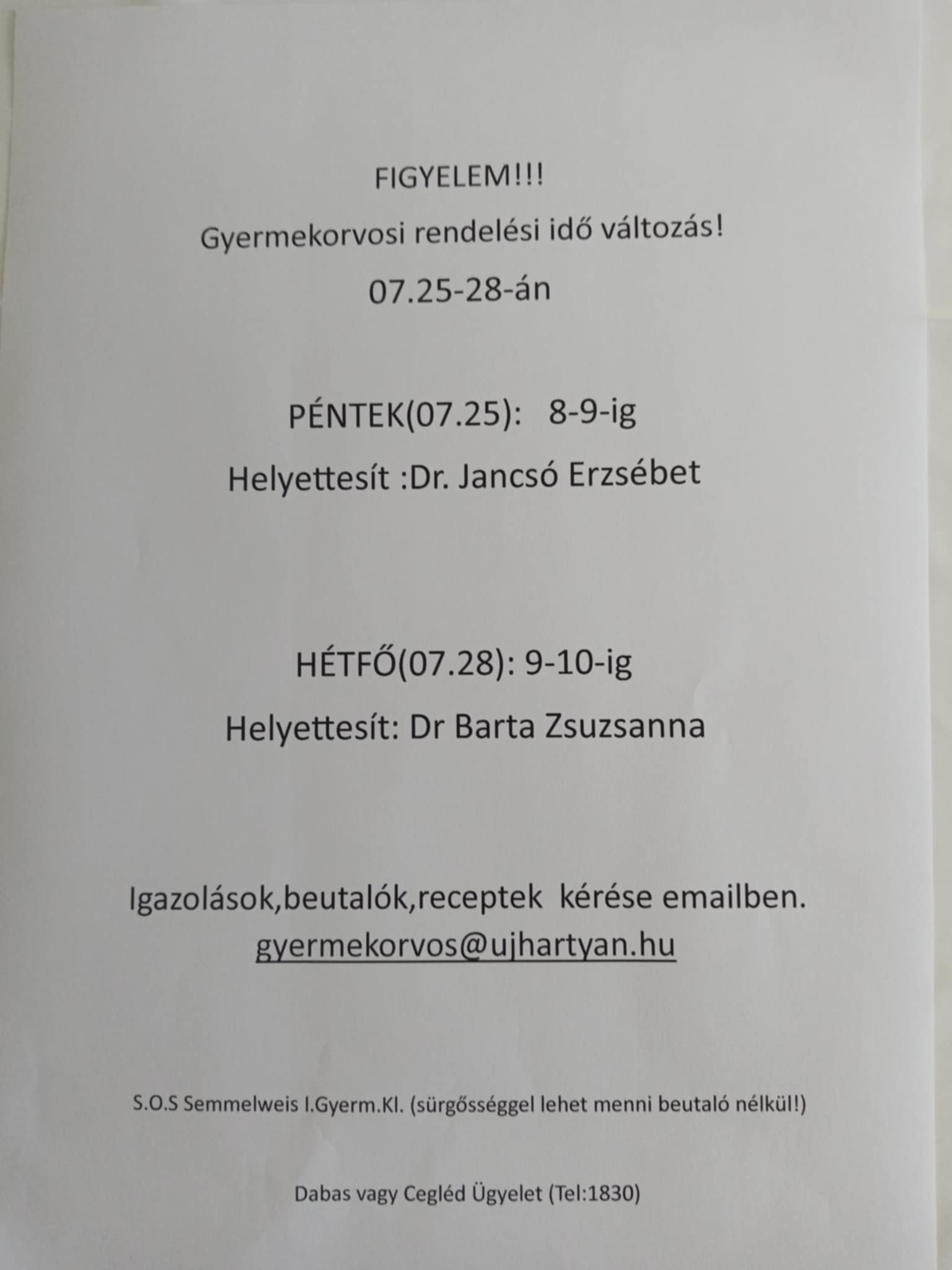 Gyermekorvos rendelési idő változás 2025.07.25 és 07.28.-án!