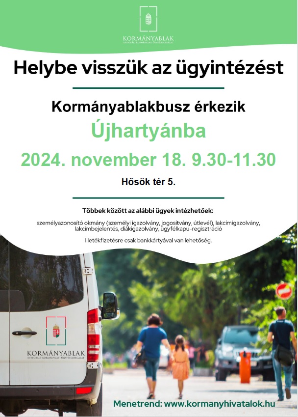 2024.11.18. 9.30-11.30. között Kormányablak ügyintézés Újhartyánban.....